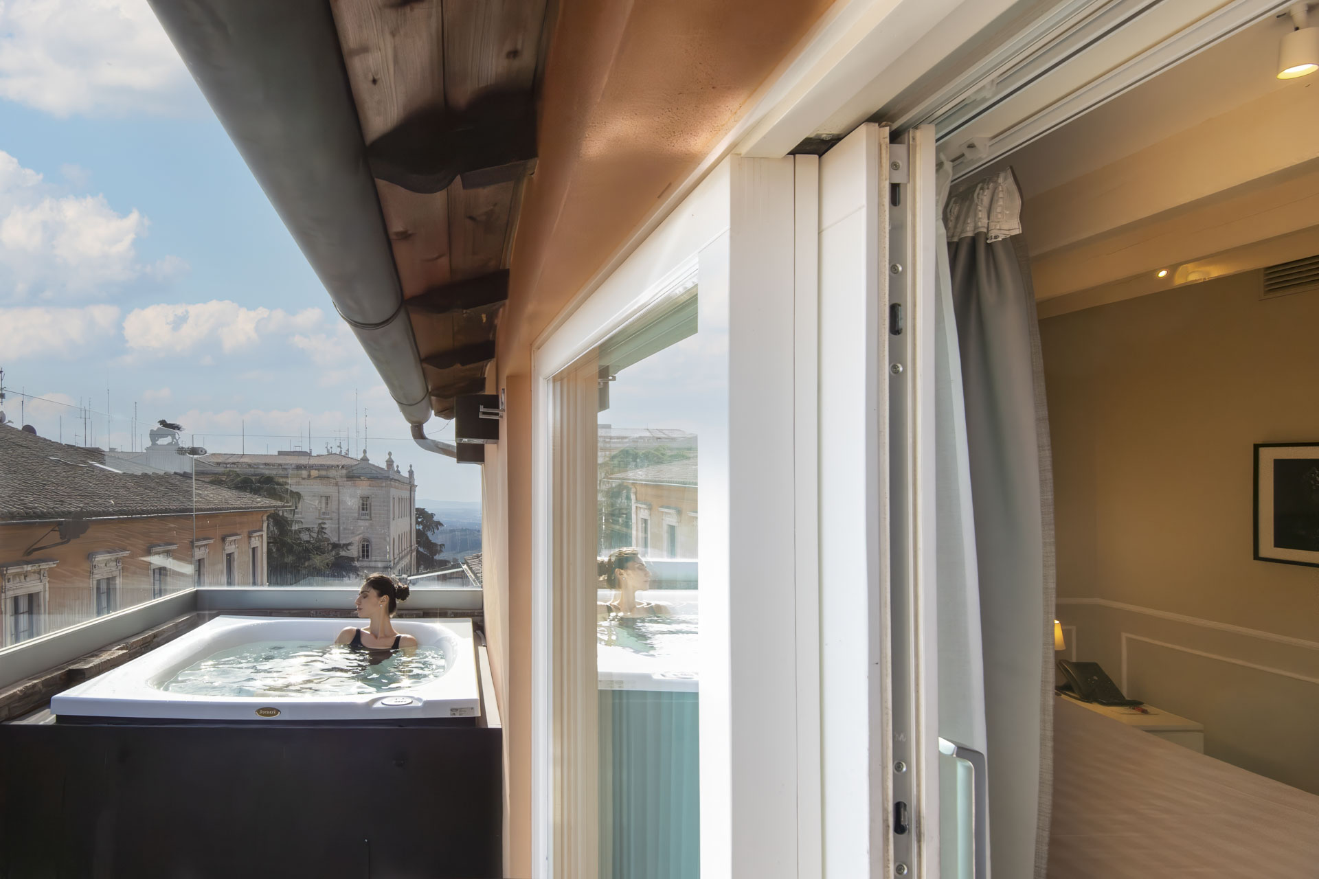 La Camera Queen con vasca idromassaggio Jacuzzi® è pensata per chi desidera un soggiorno romantico ed esclusivo nel centro storico di Perugia.